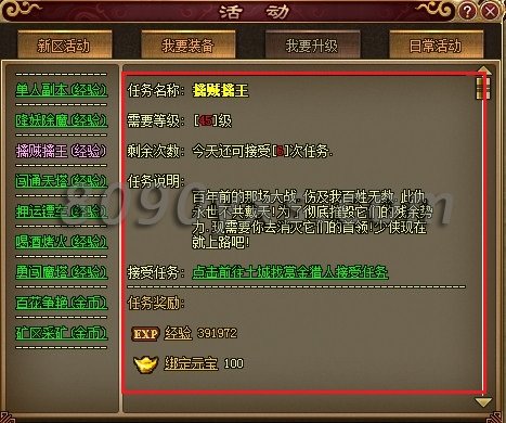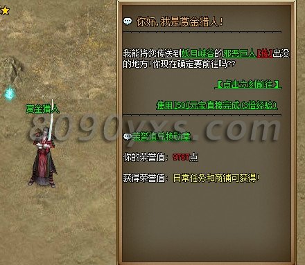 当玩家等级达到45级,就可以前往沙漠土城的NPC赏金猎人处接受“擒贼擒王”的任务,每位玩家每天有6次的任务机会,而8090《武尊》的VIP会员每天可额外增加1次任务。赏金猎人会根据各地对抗魔族怪物的情况,派出玩家前往那些形势最为危急的地方去消灭怪物的首领,比如妖月峡谷的邪恶巨人、邪恶之谷的邪恶钳虫、尸王殿的僵尸王等。
