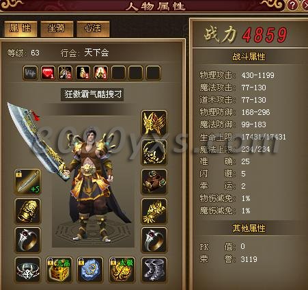 打开角色面板,第一页是任务属性,这里我们可看到和传奇差不多,显示的是人物的装备以及右边的各类属性。战斗力不仅要根据装备的好坏还有很多方面系统盘算出来的综合数据。