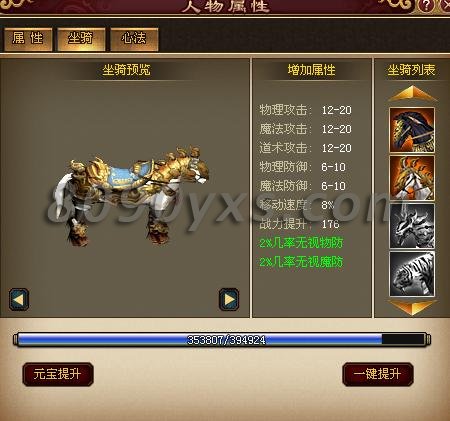 虽然每个人都有坐骑,但是8090武尊中的坐骑不仅仅是给你骑的,跑的快是一个作用但是不是最重要的,真正的坐骑作用是他的无视防御和无视魔防的属性。可以看到小编才开启2阶坐骑,可想越往后面的等级无视防御就越高哦。。绝对是一个人人有,却不是个个都能好好利用的!