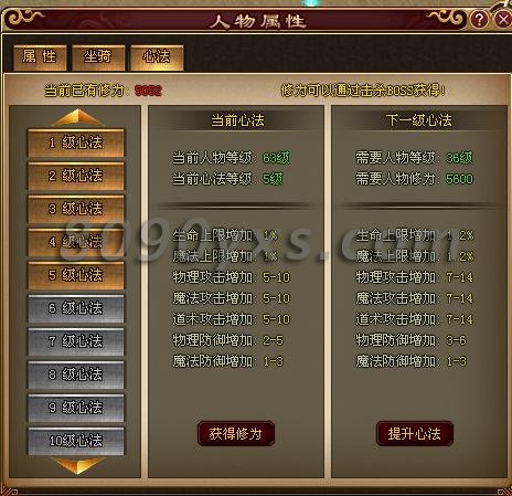 提升心法必须要获得足够的修为,修为从哪里拿呢?很简单,四处碾压低等级的BOSS 就会有不错的修为收入哦 !!提升心法让你在和你同等装备的玩家面前占尽优势吧!