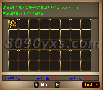在玩家游戏的过程中,总会收集到很多装备,有些装备属性实在太看不过眼的,就可以直接卖商店。但是有一些装备,虽然自己用不上,属性也不是极好,却也并不算很差的装备,直接卖商店就有些可惜,这个时候我们就可以用到装备回收的功能了。玩家回收装备之后,可以获得魂石、金币和经验,根据所回收的装备品质不同,获得的东西也不同。