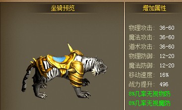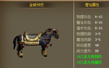 这是第一阶的坐骑,由于是坐骑的初始属性,因此外型不酷炫,属性也不霸气,不过没有关系,我们可以使用坐骑经验丹或者元宝进行提升。