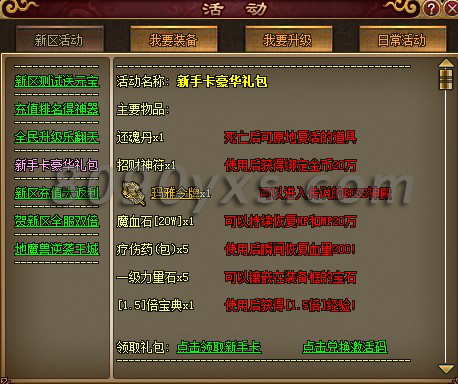 5、新手卡内容: 还魂丹药*1、招财神符*1、玛雅令牌*1、魔血石[20W]*1、疗伤药包*5、一级力量石*5、1.5倍宝典*1