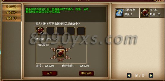 合成界面也是非常的方便玩家的操作,包袱内可以合成的物品都会在右边框中显示,只需点击即可合成,非常人性化的设计,合成分为绑定金币和金币合成,绑定金币合出来的当然是绑定的物品,不可进行交易,只有非绑定物品加上金币合成出的物品才能进行交易!