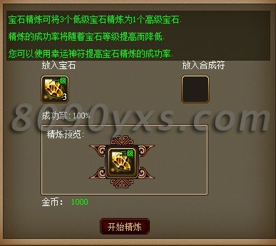 顾名思义,宝石精炼可以用来将低级宝石合成高级宝石。3个低级宝石可合成一个高一级的宝石,同时,宝石的等级越高,合成时的成功率越低。同样可以使用幸运符来提高合成的成功率。宝石精炼也需要消耗金币。