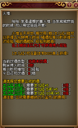 那么高年份的女儿红是怎么获得呢,在这里小编要说一下,只能喝它6瓶酒。俗话说的好劲酒虽好,可不要贪杯哦。所以在有金币的前提下,我们不 妨把女儿红的年份给合成高一点,这样虽然只能喝6瓶酒,但是所获得的经验却能够大大的提高了。一瓶就是8倍的经验。怎么样是不是很心动呢。合成方法很简单 在熔炉中 点击材料合成把低年份的女儿红丢入即可。5瓶变一瓶。