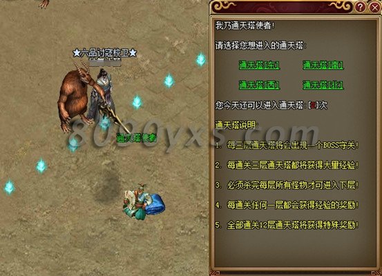 通天塔分东南西北四个方位,玩家可以选择从任意一道门进入通天塔,每天都可以挑战通天塔两次。每进入一层,《武尊》游戏系统都会提示,只有10分钟的时间来消灭地图内所有的怪物,如果在规定时间内没有将全部怪物击杀,会被强制传送出通天塔。在本层怪物击杀完毕后,玩家可以与塔内使者对话,然后进入上一层。