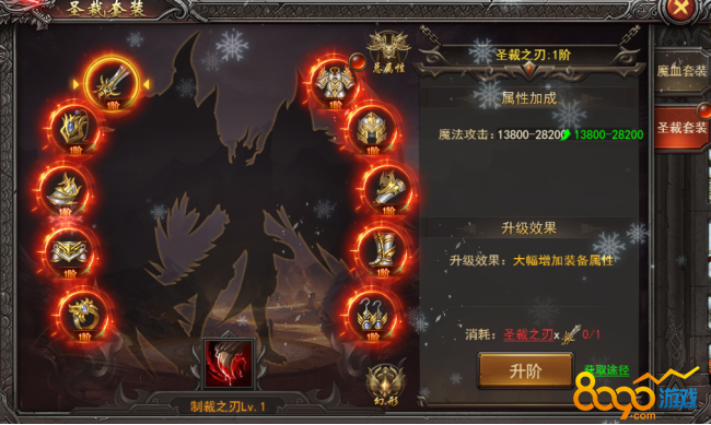 (1).3v3套装--圣裁套装:可通过战功兑换圣裁幸运箱、购买每日竞技礼包概率获取,圣裁装备可升阶,需消耗对应相同部件