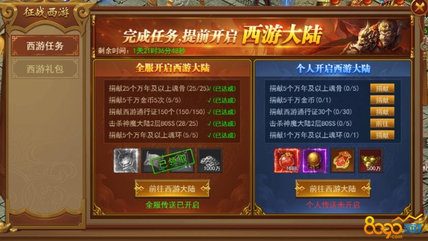 开启任务:开启任务分全民任务和个人任务,全民任务完成,本服所有玩家可提前进入,个人任务完成,个人提前进入,完成任务获得额外奖励