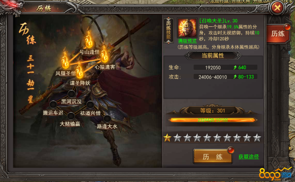 西游大陆可通过击杀怪物、参与获得获得历练值,提升历练等级,历练等级越高可进入地图越多和大圣召唤技能越强