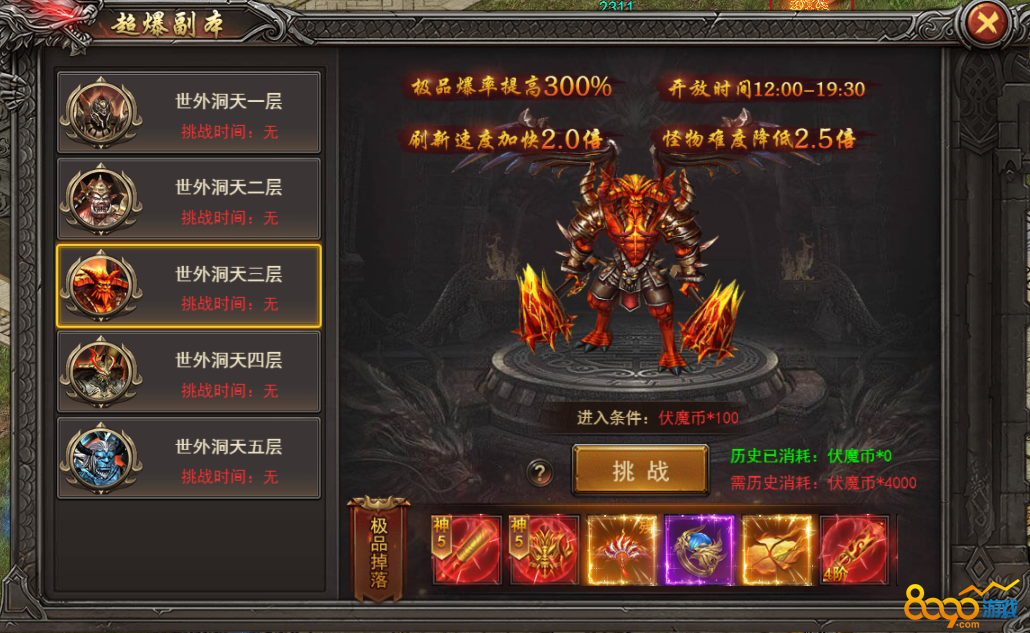 西游开放超爆副本,进入需要消耗一定伏魔币,累计消耗伏魔币次数可进入更高层