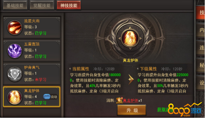 3. 新增--通用神技真龙护体,增加生命,使用技能时清除麻痹、定身状态,并有几率触发真龙护体,免疫麻痹、定身3秒,技能等级越高,真龙护体触发几率越大,3级时自动开启释放;