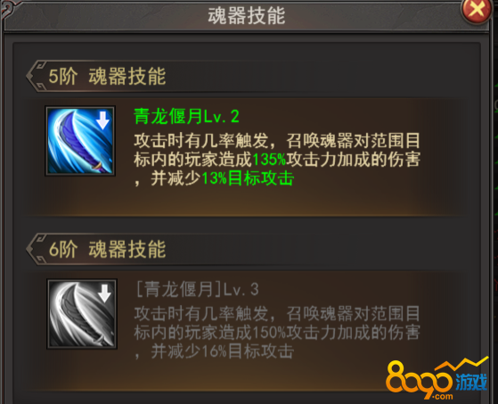 b. 青龙偃月:攻击时有概率触发,召唤魂器对范围目标内的玩家造成一定攻击力加成的伤害,并减少一定目标攻击,技能级越高,效果越强;