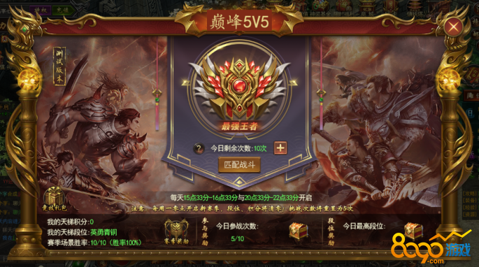 1. 新增玩法--5v5巅峰赛:开服60天后,替换1v1巅峰赛,每天11:00-11:30、21:00-21:30开启活动;