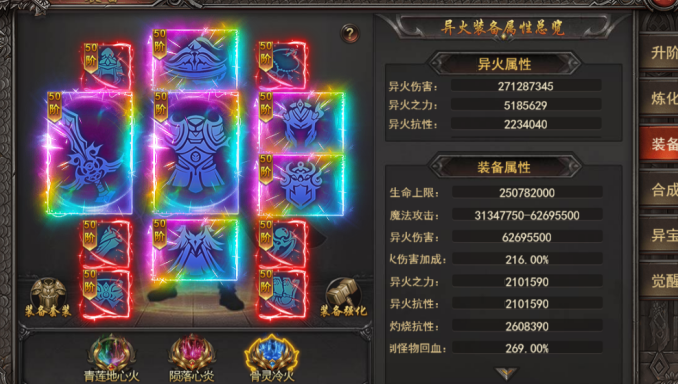 a. 穿戴异火装备可获得异火伤害,异火之力,灼烧抵抗等稀有属性,灼烧抵抗是挑战异火塔必备属性;