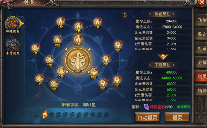 b. 消耗飞剑星石,对魂核锻灵,锻灵后提升属性,不同魂核提升属性不同