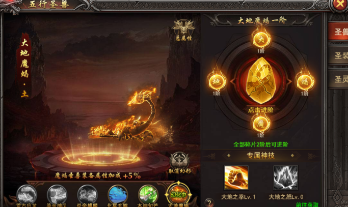 b. 可使用五行之泪·土对圣物进行升星,满星后可进阶,进阶会增加大量的土属性带出比例,最高阶可100%带出土属性;