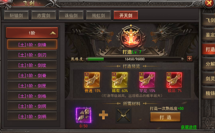 b. 每次打造会增加熟练度,提升打造等级,打造等级越高,可打造部位阶数越高,出现极品概率越大;