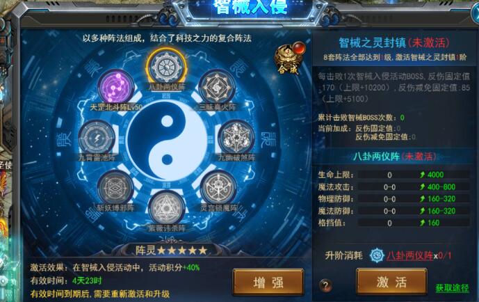 b. 8个法阵全套达到一定等级后,可以激活“智械之灵封镇”,激活后每击败一次该活动boss会增加属性;