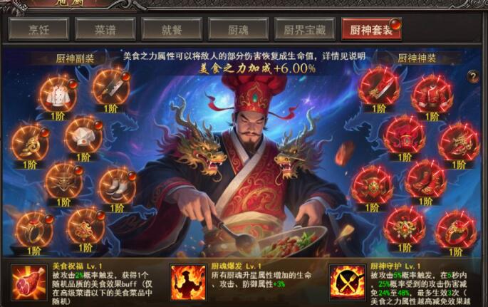 厨魂爆发:穿戴1阶5件套激活,所有厨魂升星属性增加的生命、攻击、防御属性+3%