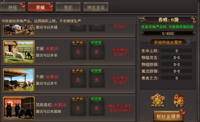 d. 扩建鸡舍、猪舍、羊圈、牛棚,可以提升属性,并增加对应的养殖产品囤积次数,生产的养殖产品达到囤积次数上限后,不能继续生产;