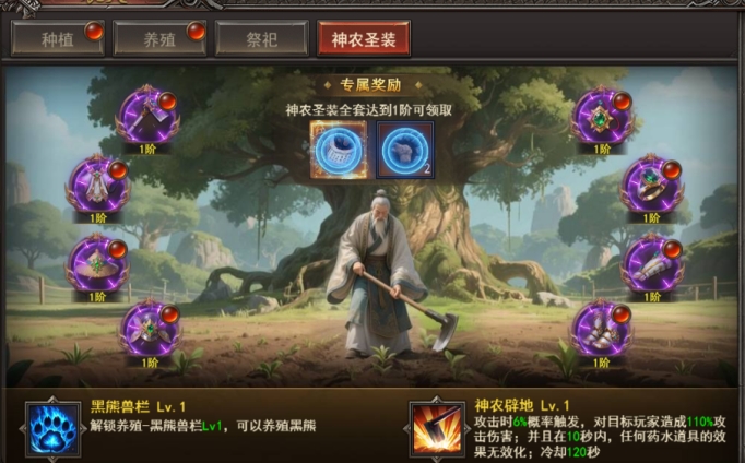 b. 穿戴1阶6件套激活专属技能--黑熊兽栏:解锁养殖--黑熊兽栏,可以养殖黑熊;