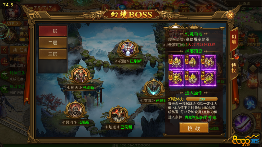 八:幻境、转生BOSS、稀有BOSS、VIP BOSS的掉落可比野外BOSS的掉落好太多了,记得留意BOSS的刷新时间,赶紧去抢夺。