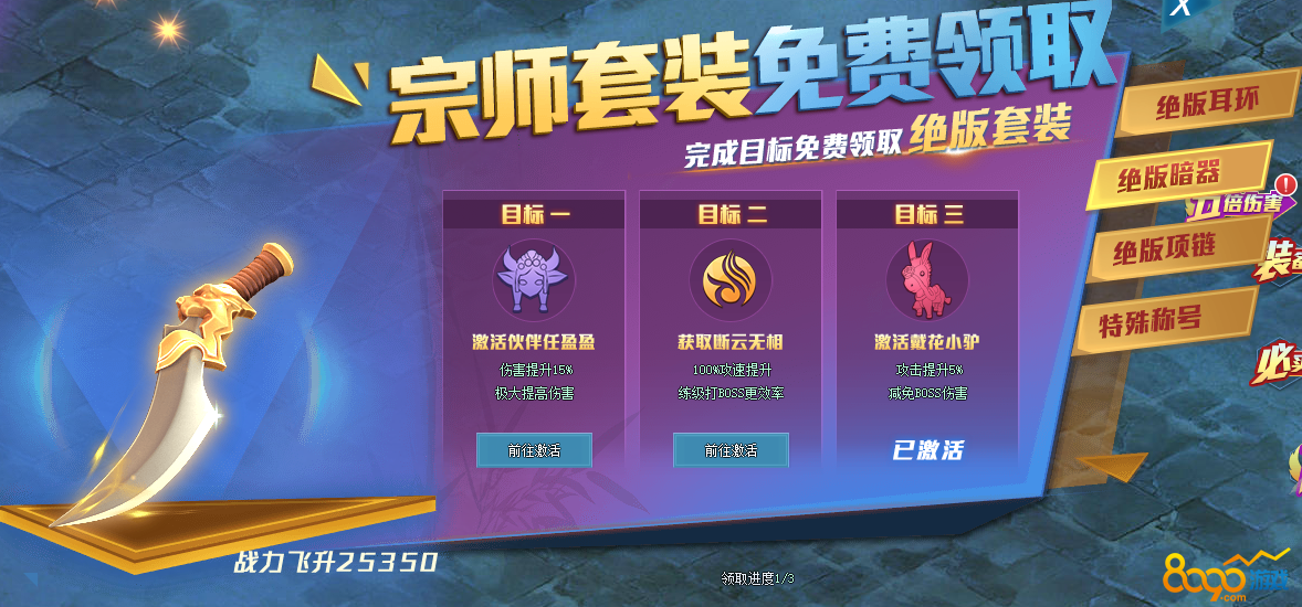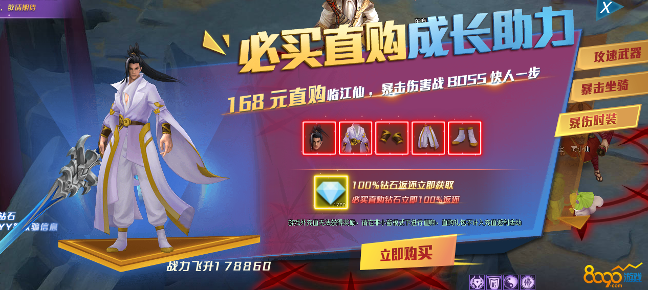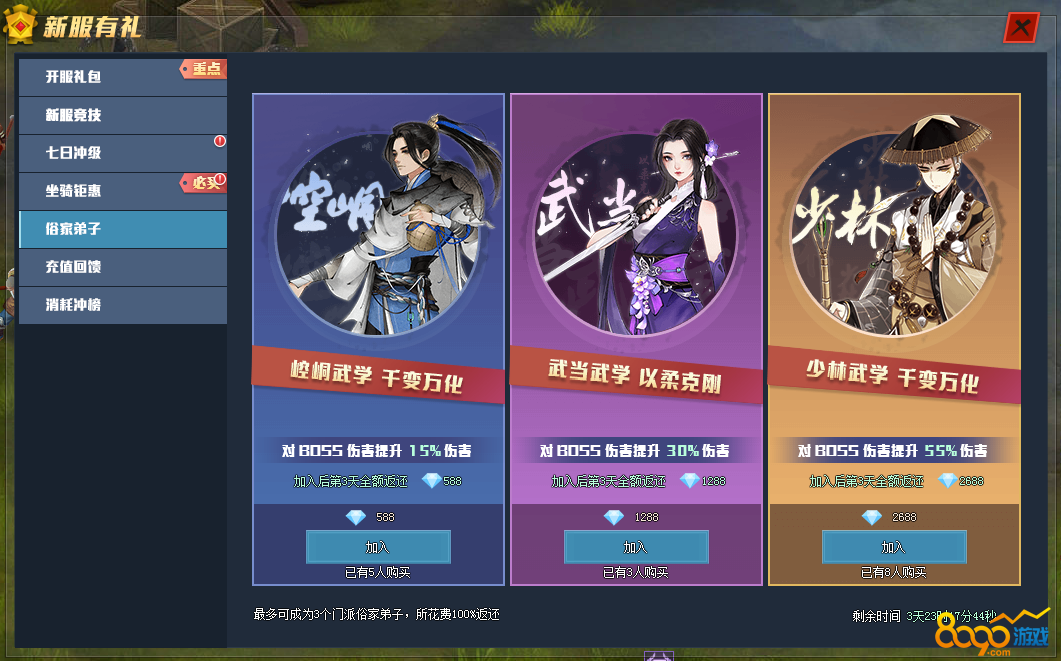 活动说明:加入门派俗家弟子,对BOSS伤害提升100%,活动结束返还所有花费!