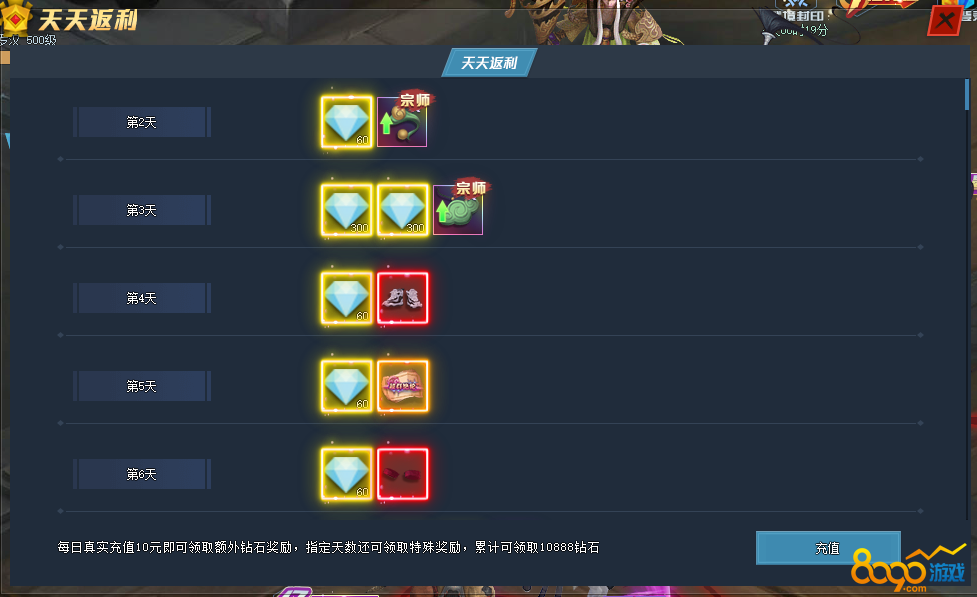 活动说明:每日真实充值10元即可领取额外钻石,指定天数还可领取特殊奖励!