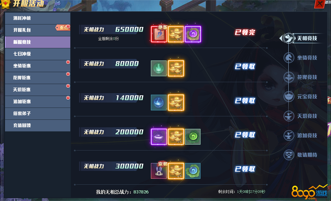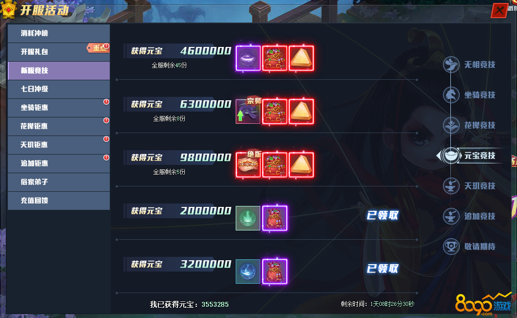 活动说明:活动期间,对玩家的无相、坐骑、花撵、元宝、天玑、兵器谱、装备打造情况进行竞技,争夺限量珍惜绝版道具。