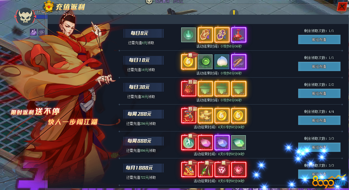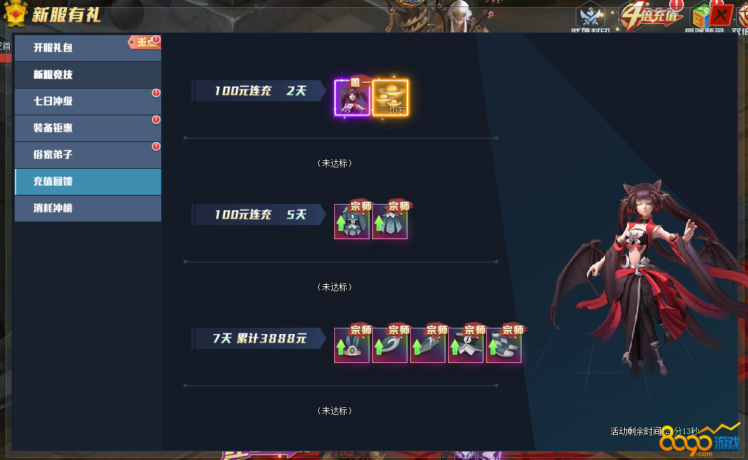 活动说明:7日累计充值可获取一转宗师装备以及唯一伙伴任盈盈!