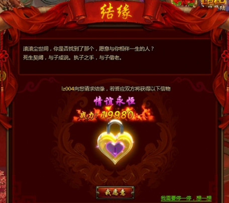申请结缘的话需要玩家消耗一定的财力才能结缘,玩家可以选择是小号3344520铜钱还是1314元宝。