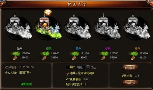 首先呢要找到灵宝仙子,她位于九天城(402,630)处。要在她这里领取灵宝,每天都有三次机会哦。点击灵宝仙子NPC,就能看到灵宝的页面了,一共有五种品质的灵宝,从低到高分别是白、绿、蓝、紫、橙。品质越高,获得的奖励也越多。