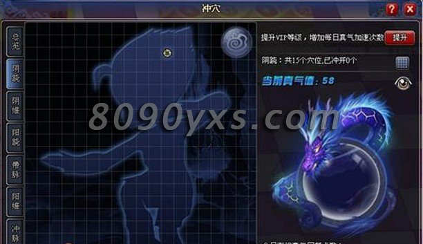 《小宝升职记》的穴位分为八大经脉,不同的等级,可开启不同的经脉。游戏中点击开启的经脉标签,即可打开对应的经脉界面,初始的经脉为一片虚无,需要玩家去探寻穴位所在,每次探寻消耗一定真气,寻到穴位后即可选择冲穴,冲穴成功即可获得穴位对应的二级属性。每冲通一条经脉可获得额外属性加成,八条经脉全通可再次获得额外属性加成。