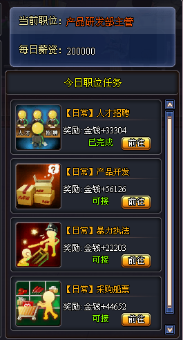 在游戏界面右上方有【组织结构】标识,点击可以进入职位挑战界面,在界面右边就有当前职位、日薪信息,以及职位任务,对于可接的任务,点击“前往”按钮则可到达相应NPC处。