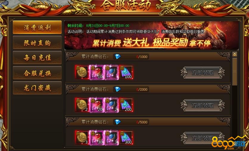 活动说明:活动期间累计消费达到条件即可领取豪华大礼!消费钻石数和奖励每日重置