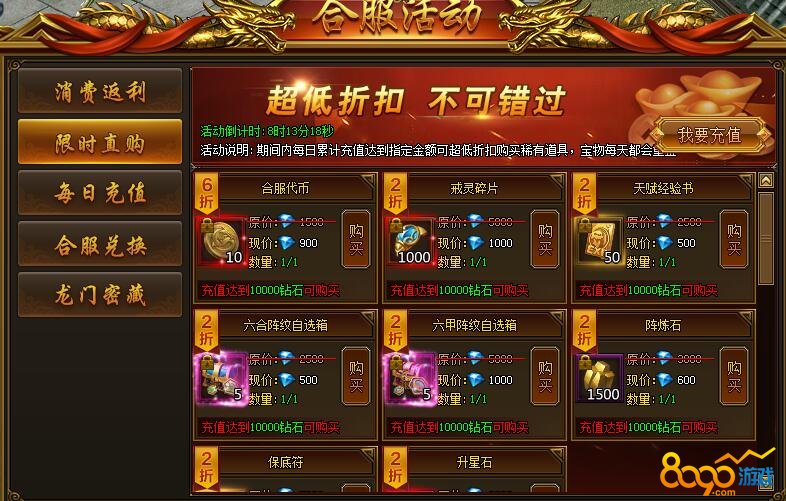 活动说明:活动期间内每日累计充值达到指定金额可以超低折扣购买稀有道具,奖励每天都会重置