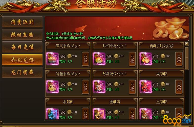 活动说明:参与合服活动可获得合服代币,合服代币可用来兑换多种珍稀物品