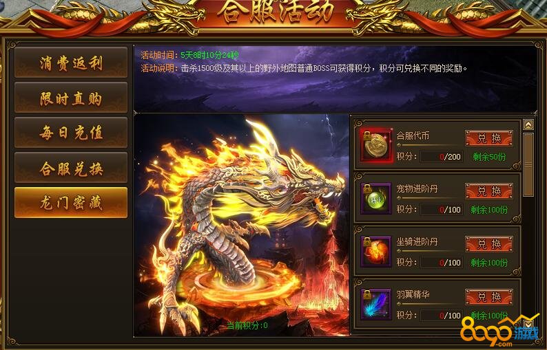 活动说明:击杀1500级及以上的野外地图普通boss可获得积分,积分可兑换不同的奖励