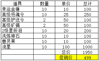百元豪华充值礼包:绝世橙将进阶卡*1【使用后,可直接将“紫将·西施”进阶成30级橙将“沉鱼·西施”(珍藏版橙将),该道具只可对紫将·西施使用】、紫魂*500、流星精华*1、1级星辰泪*30、诸葛锦囊*10、高级将魂令*10、高级矿镐*3、幸运金锤*10、寒铁*10。