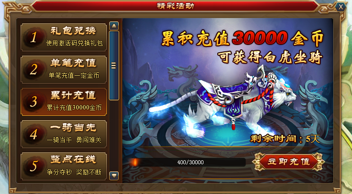 开服前七天,玩家在游戏内充值累计至30000金币以上(包含30000金币),即可获得绝版坐骑-白虎。