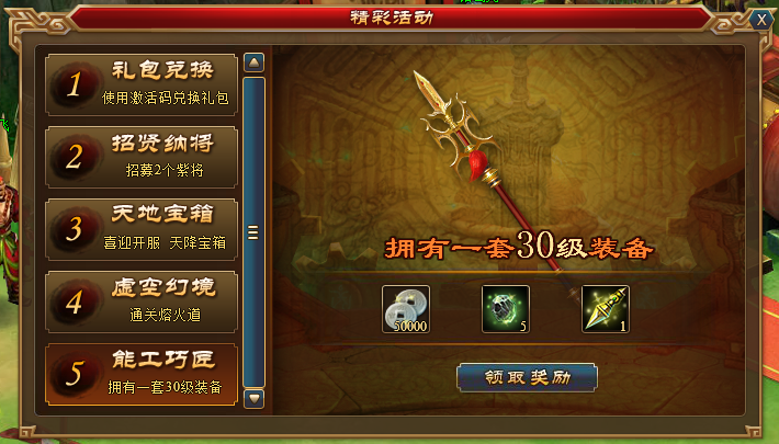 1)升级装备奖励:点击游戏界面上方“精彩活动→能工巧匠” 手动领取奖励;