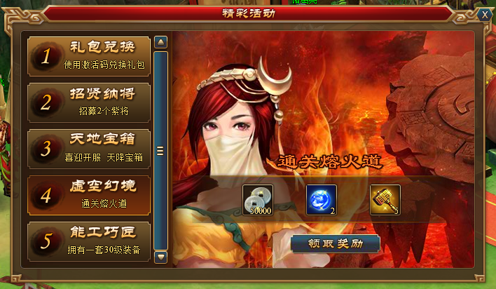 2、新服开服后,玩家通关虚空幻境“熔火道”、“玄冰窟”、“修罗场”将能分别领取到对应的奖励;