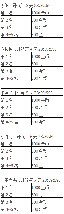 开服前三、四、五、六、七天,等级、竞技场、坐骑、战斗力、一骑当先排行前5名的玩家可获得丰厚奖励。