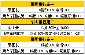 开服前三天,服务器内排行榜前三名的军团全体成员和军团长将获得丰厚奖励。