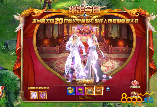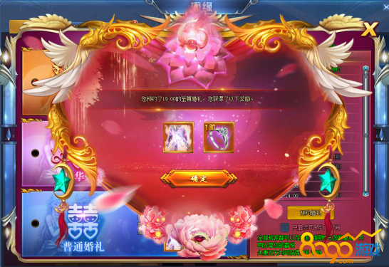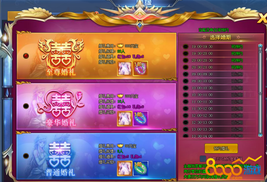 2、 婚礼类型分为多种,不同类型的婚礼消耗的元宝和获得的道具奖励也不同,婚礼规格越高,可进入的人数也越多。。