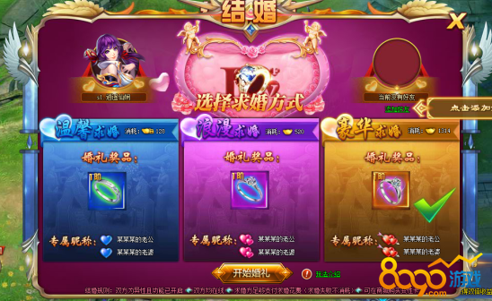 6、 发起求婚请求前,求婚者需要挑选结婚方式,不同的求婚方式,需要消耗不同的货币和货币数量。