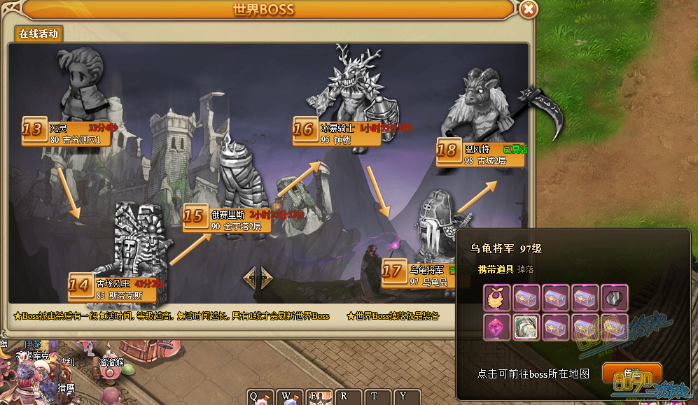 乌龟将军世界BOSS等级是97级。在地图乌龟洞穴里刷新。乌龟将军的掉落也是十分的给力的。具体掉落:3阶武器宝箱,3阶饰品宝箱,3阶装备宝箱,4阶武器宝箱,4阶饰品宝箱,4阶装备宝箱。铝+4,神之金属+3,爱丽丝的围裙,乌龟将军卡牌。