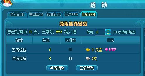 若今天24:00前精力值未用完,次日0:00将会累计到经验领取,次日之后可以消耗少量银子或元宝直接领取经验。