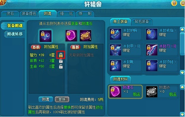 对于没有元宝买附魂锁的朋友来说,争取附魂出一个7星以上的攻击属性,就可以了,其他的属性可以先不看。